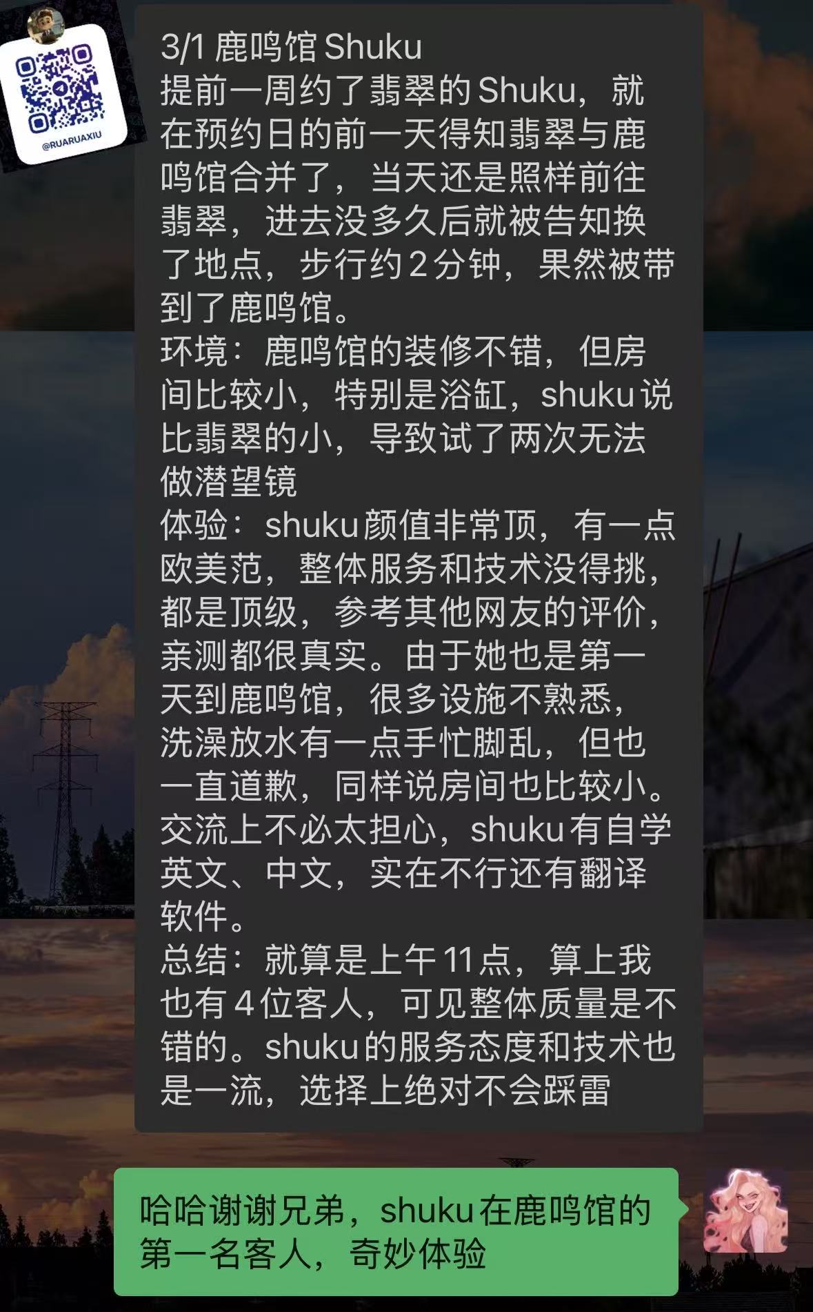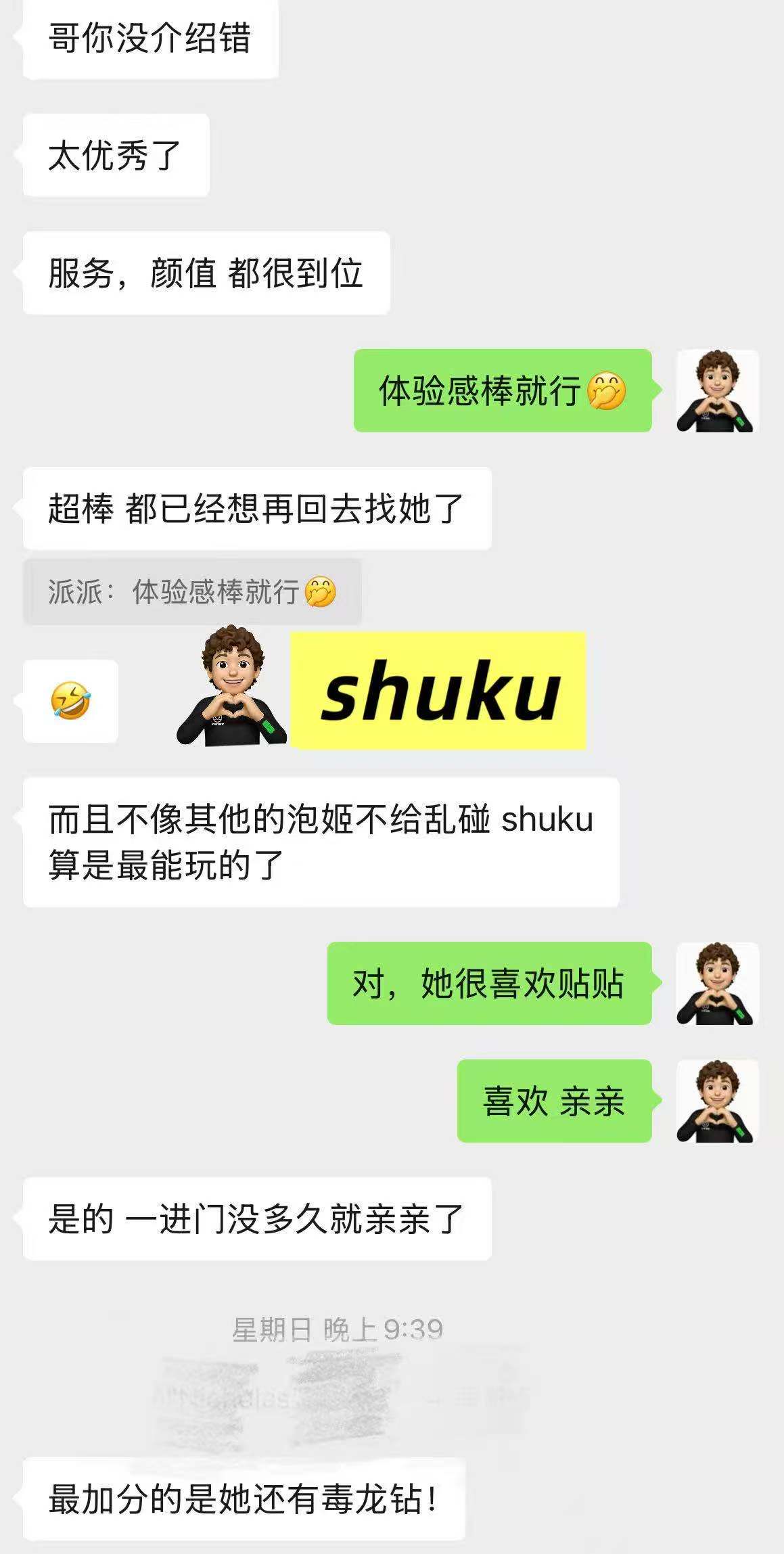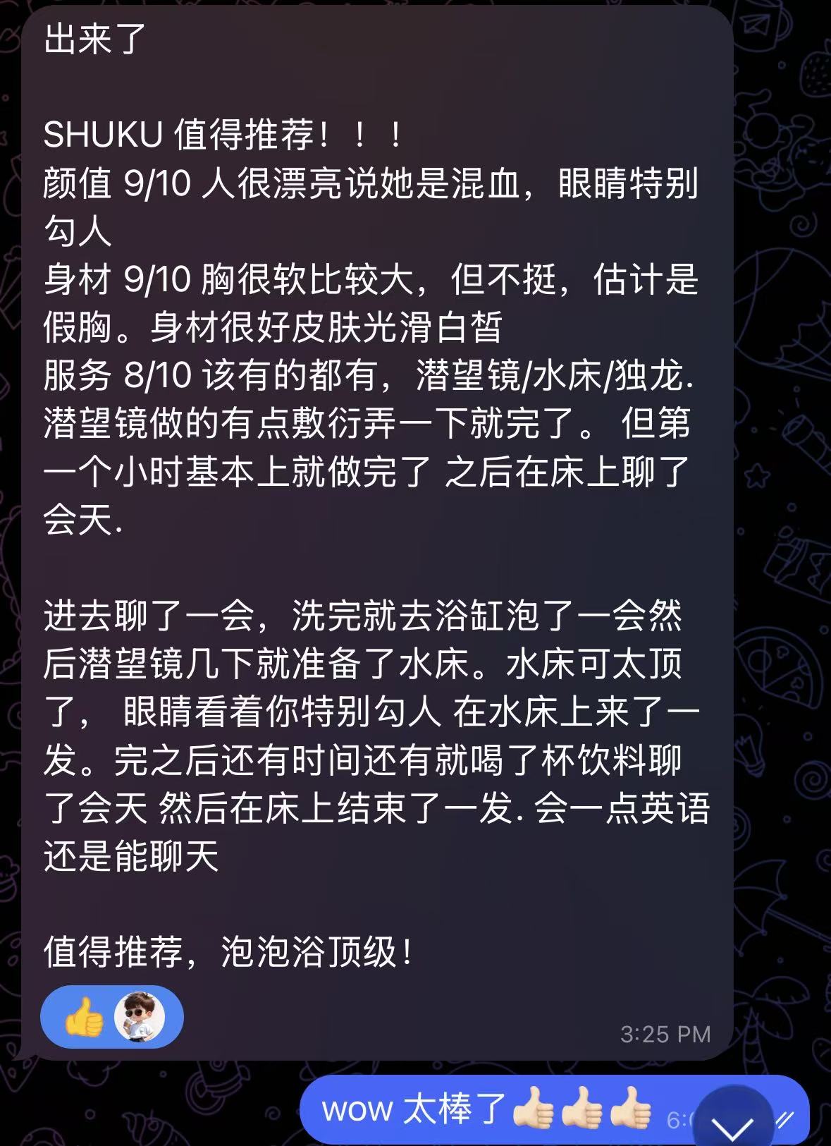 しゅく:六边形战士,各方面挑不出毛病。颜值上很漂亮,是很有气质的类型,并且很耐看。身材上腰细腿细但大屁股大胸,胸C~D之间,手感很好应该没有科技。服务上该有的都有,舌吻、无套口(先洗)、毒龙、舔脚等一应俱全,水床技术全面。沟通上会点英语,并且很积极找话题。做爱时反馈很激烈,同时具备一些风骚魅魔属性。