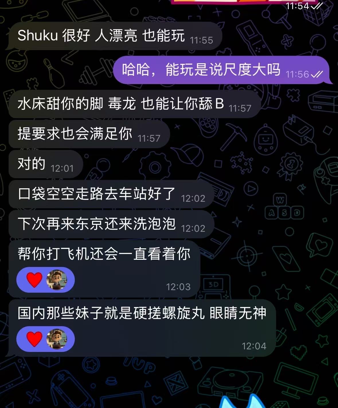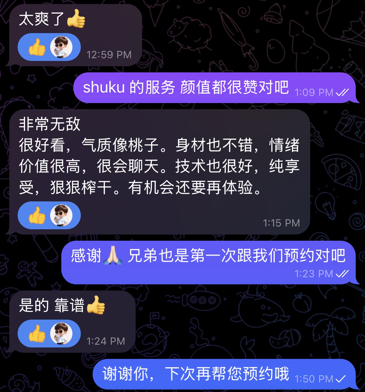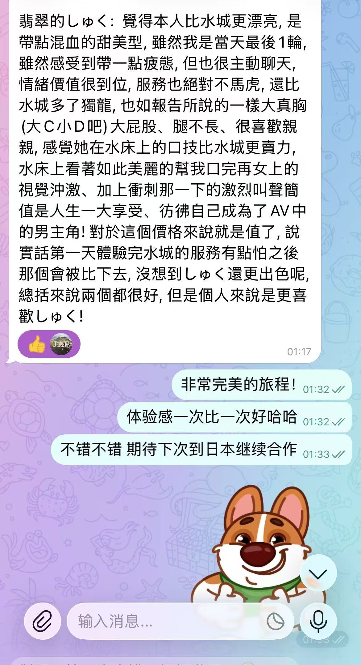 しゅく:六边形战士,各方面挑不出毛病。颜值上很漂亮,是很有气质的类型,并且很耐看。身材上腰细腿细但大屁股大胸,胸C~D之间,手感很好应该没有科技。服务上该有的都有,舌吻、无套口(先洗)、毒龙、舔脚等一应俱全,水床技术全面。沟通上会点英语,并且很积极找话题。做爱时反馈很激烈,同时具备一些风骚魅魔属性。