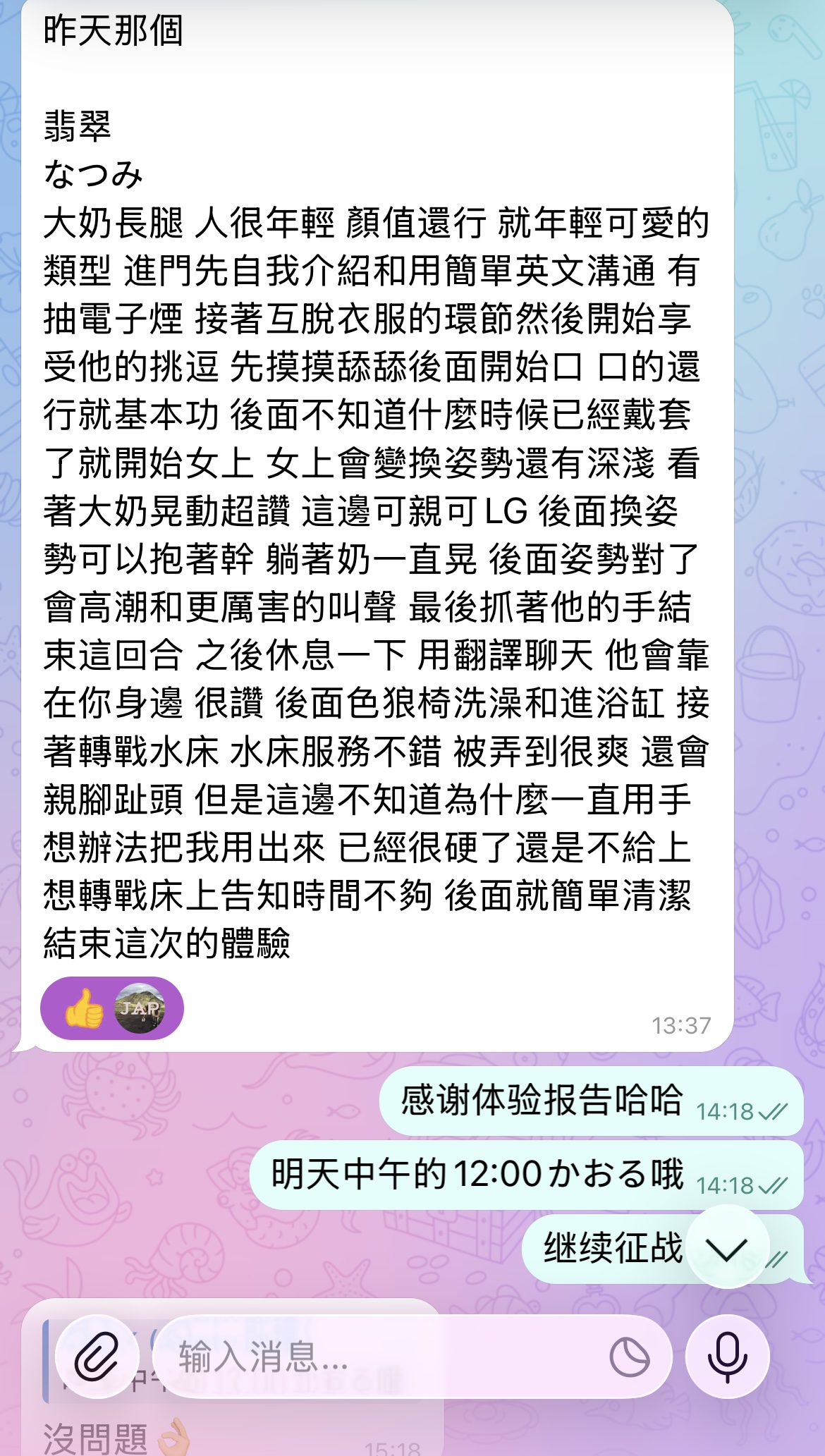 Natsumi就看上去跟AV里面差不多,说话声音可爱,有一起进浴缸,水床技术也不错。本番反应也有给到。英文不行,有很主动用手机翻译聊天。